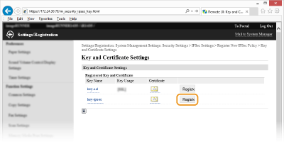 انقر فوق [Register Default Key] يمين زوج المفاتيح الذي ترغب في استخدامه.