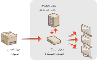 يمكن للجهاز الاتصال بشبكة 802.1X بصفته جهاز عميل. تتكون شبكة 802.1X النموذجية من خادم RADIUS (خادم المصادقة), ومحول LAN (المصدّق), والأجهزة العميلة التي تشتمل على برامج مصادقة (العملاء). وإذا حاول أحد الأجهزة الاتصال بشبكة 802.1X، فسيتعين على هذا الجهاز الخضوع لمصادقة المستخدم للتأكد من إنشاء هذا الاتصال بواسطة المستخدم. يتم إرسال بيانات المصادقة إلى خادم RADIUS ويتم فحصها من خلاله، وهو ما يعمل بدوره على إتاحة الاتصال بالشبكة أو رفضه وذلك وفقًا لنتيجة المصادقة. وإذا فشلت المصادقة، فسيحظر محول LAN (أو نقطة وصول) الوصول من خارج الشبكة.