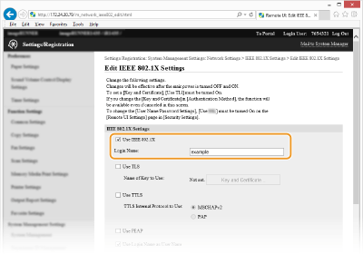 حدد خانة الاختيار [Use IEEE 802.1X] وأدخل اسم تسجيل الدخول في مربع النص، [Login Name:] ثم حدد الإعدادات المطلوبة.