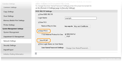 تستخدم طريقة المصادقة هذه اسم مستخدم وكلمة مرور لمصادقة العميل وشهادة CA لمصادقة الخادم. يمكن تحديد MSCHAPv2 أو PAP كبروتوكول داخلي. ويمكن استخدام TTLS مع PEAP في نفس الوقت. قم بتمكين TLS لواجهة المستخدم البعيدة قبل تكوين طريقة المصادقة هذه (تمكين الاتصال المشفر باستخدام بروتوكول TLS لواجهة المستخدم البعيدة).