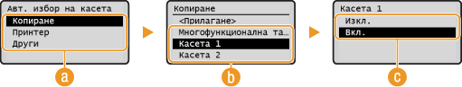 Активирайте или деактивирайте автоматичния избор на касета като източник на хартия. Ако за автоматичен избор на касета за хартия е зададена настройка <Вкл.>, машината автоматично избира заредена хартия с подходящ формат. Също така, когато хартията свърши, тази настройка позволява отпечатването да продължи чрез превключване от един източник на хартия към друг, който е зареден с хартия със същия формат. Можете да изберете функция (например копиране или печат), за да активирате тази функция.