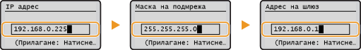 <Маска на подмрежа> <Адрес на шлюз>.Въведете настройката чрез бутоните с цифри и натиснете