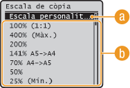 Podeu ampliar o reduir les còpies mitjançant una escala de còpia predefinida, com ara <A5->A4>, o bé establint una escala de còpia personalitzada en increments de l'1 %.