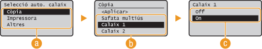 Seleccioneu <On> per activar la selecció de calaix automàtica per a l'origen de paper que heu seleccionat a la pantalla anterior (