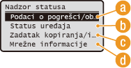 Prikazuje status uređaja, kao što je količina preostalog papira ili tonera.