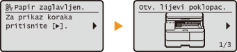 U nekim slučajevima pogreške prikazuju upute o otklanjanju pogreške. Da biste riješili problem, slijedite upute na zaslonu. Zaslon koji se prikazuje pri zaglavljenom papiru prikazan je ispod kao primjer (
