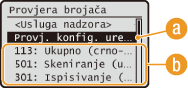 (Provjera brojača), prikazat će se izbornik <Provjera brojača>. Na ovom izborniku možete vidjeti stanja brojača kao i serijski broj i konfiguraciju uređaja.