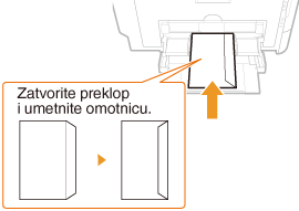 U ovom dijelu opisuje se u kojem smjeru uložiti omotnice i kako ih pritom okrenuti, kao i postupci koje treba izvršiti prije nego omotnice uložite. Opis općenitog postupka umetanja papira u višenamjenski odlagač potražite u Umetanje papira u višenamjenski odlagač.
