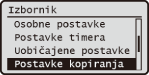 Na popisu se nalaze sve postavke kopiranja s kratkim opisima. Zadane su postavke označene bodežom (