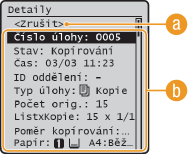 Zobrazí se počet kopií, nastavení a další údaje. Chcete-li si pouze zkontrolovat údaje, aniž byste rušili kopírování, vraťte se na hlavní obrazovku kopírování stisknutím tlačítka