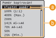 Kopie lze zvětšit nebo zmenšit pomocí předvolených poměrů kopírování, například <A5->A4>, nebo nastavením vlastního poměru kopírování v krocích po 1 %.