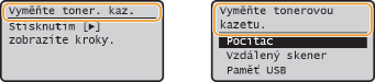 Obsah zprávy, která se zobrazí, závisí na množství zbývajícího toneru. Zpráva může buď vyzývat k přípravě tonerové kazety, kterou bude třeba vyměnit, nebo přímo k výměně této kazety.