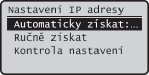 Vyberte, pokud chcete automaticky přiřazovat adresu IP pomocí protokolu, například DHCP. Když se zobrazí <Autom. získat: Zapnuto>, je povoleno automatické adresování.