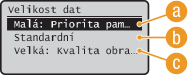 Na zařízení můžete zadat poměr komprese souborů, který se použije, když jsou dokumenty skenovány do zadaného souborového formátu (Výběr formátu souboru). Volba <Malá: Priorita paměti> zvyšuje poměr komprese oproti normální hodnotě a vytvořené soubory jsou menší, ale s nižší kvalitou obrazu. Volba <Velká: Priorita kvality obrazu> naopak snižuje poměr komprese oproti normální hodnotě a vytvořené soubory větší, ale s vyšší kvalitou obrazu.