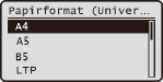 Hvis den skærm, der er angivet herover, ikke vises, når der er ilagt papirHvis du altid lægger det samme papir i den universalbakken, kan du springe betjeningen af papirindstillingerne over ved at registrere papirformatet og -typen som standardindstillingen. Når standardindstillingen er blevet registreret, vil den skærm, der er angivet herover, imidlertid ikke blive vist. Hvis du vil vise skærmen, skal du vælge <Fra> for <Reg. standardindstil.> (Registrering af standardpapirindstillingerne for universalbakken).