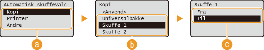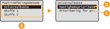 Alle indstillingerne for papirskuffen og papirfremføringsmetoden vises med korte beskrivelser. Standardindstillingerne er angivet med en daggert (