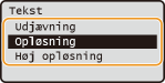 Angiv databehandlingsmetoden til gengivelse af halvtoner (området mellem de lyse og mørke områder). Du kan vælge <Opløsning>, <Udjævning> eller <Høj opløsning> separat for tekst, grafik og billeder.