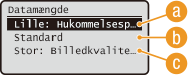 Du kan angive det komprimeringsforhold, der anvendes, når dokumenterne scannes i det filformat, du angav (Valg af et filformat). <Lille: Hukommelsesprioritet> giver et større kompressionsforhold end normalt for at oprette mindre filer med lavere billedkvalitet. På den anden side giver <Stor: Billedkvalitetsprioritet> et lavere kompressionsforhold end i normale store filer med højere billedkvalitet.