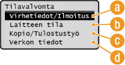 Näyttää laitteen tilan, esimerkiksi jäljellä olevan paperin tai väriaineen määrän.