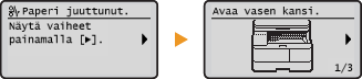 Joissakin tapauksissa, kun tapahtuu virhe, näytetään ohjeet virheen korjaamiseksi. Ratkaise ongelma noudattamalla näyttöön tulevia ohjeita. Alla näytetään esimerkkinä näyttö, joka tulee esiin, kun tapahtuu paperitukos (