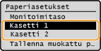 <Kasetti 2> avautuu vain, jos laitteeseen on asennettu lisävarusteena saatava paperikasetti (kasetti 2).