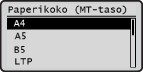 Jos yllä olevaa näyttöä ei näytetä, kun paperia lisätäänJos käytät aina samaa paperia monitoimitasolla, voit ohittaa paperiasetustoiminnot tallentamalla paperikoon ja -tyypin oletusasetuksiin. Kun oletusasetus on tallennettu, yllä olevaa näyttöä ei näytetä. Voit näyttää näytön valitsemalla <Ei> kohdassa <Tallenna oletusaset.> (Monitoimitason oletuspaperiasetuksien tallentaminen).