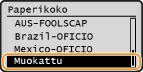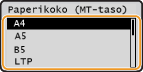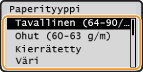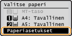 Kun oletuspaperiasetus on tallennettu, paperiasetusnäyttöä ei näytetä, kun paperia lisätään, ja samaa asetusta käytetään aina. Jos lisäät erilaista paperikokoa tai -tyyppiä vaihtamatta paperiasetuksia, laite ei ehkä tulosta oikein. Voit välttää tämän ongelman poistamalla oletusasetuksen käytöstä valitsemalla <Ei> vaiheessa 3 ja lisäämällä sitten paperin.