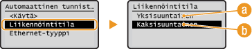 valitse <Yksisuuntainen> tai <Kaksisuuntainen> .![]() <Yksisuuntainen>Tietoja lähetetään ja vastaanotetaan vuorotellen. Valitse tämä, kun laite on yhdistetty verkkoon yksisuuntaisessa tilassa.