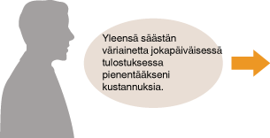 Aseta tulostinajurissa oletusasetukseksi värinsäästötulostus. Tällöin voit tulostaa asiakirjasi käyttäen vähemmän väriä ilman että muuttaisit asetuksen aina kun tulostat. Tulostuksen oletusasetusten muuttaminen