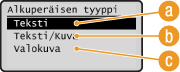 Voit valita skannauksen kuvanlaadun asiakirjatyypin mukaan, esimerkiksi vain tekstiä sisältävät asiakirjat, kuvia ja kaavioita sisältävät asiakirjat tai lehtikuvat.