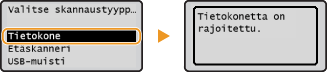 Jos [Skannaus] -valintaruutu on valittu, asiakirjojen skannaaminen USB-muistilaitteisiin on poistettu käytöstä. Voit myös poistaa käytöstä asiakirjojen skannaamisen tietokoneelle laitteiden <Tietokone> ja <Etäskanneri> kautta. Voit kuitenkin poistaa käytöstä asiakirjojen skannaamisen tietokoneelle vain niin, että se koskee kaikkia osastotunnuksia. (Töiden estäminen, kun osastotunnus on tuntematon).