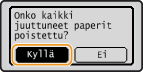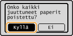 Jos paperi juuttuu, näytössä näkyy <Paperi juuttunut.>. Näytä yksinkertaiset ratkaisut painamalla