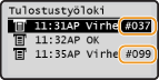 Kolminumeroinen luku (virhekoodi) on raportissa tai <Tilavalvonta> -ikkunassa jos tapahtuu virhe, kuten tulostuksen epäonnistuminen tai muistin täyttyminen. Tarkista allaolevat tiedot kunkin virhekoodin syystä ja ongelman ratkaisusta.