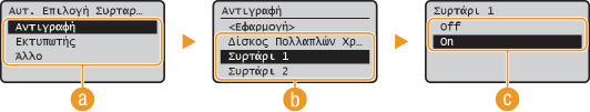 Ενεργοποιήστε ή απενεργοποιήστε τη λειτουργία αυτόματης επιλογής συρταριού για τις πηγές χαρτιού. Εάν η λειτουργία αυτόματης επιλογής συρταριού έχει οριστεί σε <On> κατά την εκτύπωση εγγράφων, επιλέγεται αυτόματα η πηγή χαρτιού που έχει το κατάλληλο μέγεθος χαρτιού. Επίσης, όταν εξαντληθεί το χαρτί, αυτή η ρύθμιση επιτρέπει συνεχή εκτύπωση, αλλάζοντας από μία πηγή χαρτιού σε μια άλλη με το κατάλληλο μέγεθος χαρτιού. Μπορείτε να επιλέξετε μια λειτουργία, όπως αντιγραφή ή εκτύπωση, για να ενεργοποιήσετε αυτήν τη δυνατότητα.