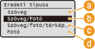 Kiválaszthatja a másolás optikai képminőségét a dokumentum típusa – például csak szöveges dokumentum, diagramokat és ábrákat tartalmazó dokumentum vagy újságfényképek – szerint.
