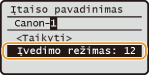 , jei norite perjungti įvedamo teksto tipą. Pasirinktas teksto tipas rodomas kaip <Įvedimo režimas: A>. Galite pasirinkti tris tipus: <A> (didžiosios raidės) , <a> (mažosios raidės) arba <12> (skaičiai).