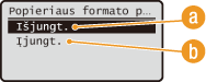 <Numatytasis pop. form.> ir Numatytasis pop. tipas> negalima nurodyti atskirai. Ekrane <Numatytasis pop. form.> nurodykite popieriaus formatą, tada ekrane <Numatytasis pop. tipas> nurodykite popieriaus tipą.