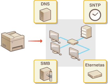 Tinklo konfigūravimas skiriasi atsižvelgiant į tinklo paskirtį. Aparatas sukurtas taip, kad būtų suderinamas su kiek įmanoma daugiau tinklo konfigūracijų, taip pat jame yra įvairių technologijų. Pasitarkite su tinklo administratoriumi ir nustatykite jūsų tinklo aplinką atitinkančią konfigūraciją.