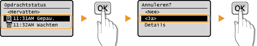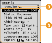 Hier ziet u het aantal kopieën, de gekozen instellingen en andere details. Als u alleen de details wilt controleren zonder het kopiëren te annuleren, drukt u op