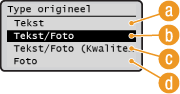 U kunt de optische beeldkwaliteit voor de kopie selecteren op basis van het documenttype, zoals documenten met alleen tekst, documenten met grafieken en tabellen of documenten met tijdschriftfoto's.