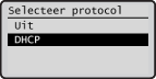 Als u DHCP niet wilt gebruiken om een IP-adres toe te wijzen Selecteer <Uit>. Wanneer u <DHCP> selecteert wanneer de DHCP-service niet beschikbaar is, zoekt de machine of er services in het netwerk beschikbaar zijn en zal sprake zijn van onnodige communicatie. |