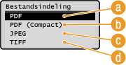 U kunt kiezen uit vier bestandsindelingen waarnaar documenten kunnen worden omgezet: <PDF>, <PDF (Compact)>, <JPEG> en <TIFF>. Gescande documenten worden geconverteerd naar de bestandsindeling die u hier opgeeft, en dan in het USB-geheugenapparaat opgeslagen.