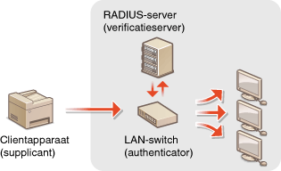 Het apparaat kan als een clientapparaat worden aangesloten op een 802.1X-netwerk. Een doorsnee 802.1X-netwerk bestaat uit een RADIUS-server (verificatieserver), een LAN-switch (verificator) en clientapparaten met verificatiesoftware (aanvragers). Als een apparaat probeert verbinding te maken met het 802.1X-netwerk, moeten de gebruikersgegevens worden geverifieerd om er zeker van te zijn dat de verbinding tot stand wordt gebracht door een bevoegde gebruiker. Hiertoe worden verificatiegegevens verzonden naar en gecontroleerd door een zogenaamde RADIUS-server, die op basis van het verificatieresultaat communicatie met het netwerk toestaat of weigert. Als de verificatie mislukt, wordt de externe toegang tot het netwerk geblokkeerd door een LAN-switch.