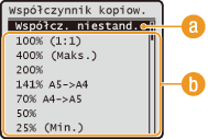 Istnieje możliwość powiększania lub zmniejszania kopii poprzez użycie wcześniej ustawionego współczynnika kopiowania, takiego jak <A5->A4>, lub ustawienie niestandardowego współczynnika kopiowania (z dokładnością do 1%).