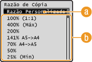 Pode ampliar ou reduzir cópias utilizando um rácio de cópia predefinido, como <A5->A4> ou definindo um rácio de cópia personalizado em incrementos de 1%.