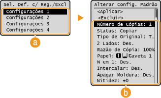 <Configs. Favoritas> <Registrar/Excluir> selecione a definição <Excluir> <Sim> .As definições gravadas permanecem guardadas mesmo quando a máquina é desligada.