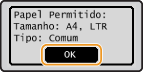 Certifique-se de que colocou na máquina o tamanho e o tipo de papel apresentados no ecrã e prima