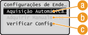Selecione esta opção para atribuir automaticamente um endereço IP através de um protocolo como, por exemplo, DHCP. Quando aparece <Aquisição Automática: Ativado>, a atribuição automática de endereço está ativada.