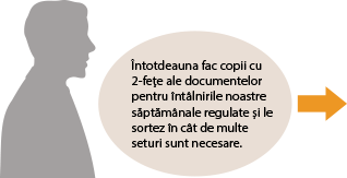 Mergeţi la <Setări favorite> şi înregistraţi combinaţia <Pe 2 feţe> şi <Asamblare> la <Pornit>. Puteţi apoi să folosiţi această combinaţie de setări de câte ori aveţi nevoie. Înregistrarea setărilor de copiere folosite în mod frecvent