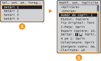 <Setări favorite> <Înregistrare/Ştergere> selectaţi setarea editaţi setarea <Aplicare> <Da> .Dacă doriţi să ştergeţi o setare înregistrată, apăsaţi